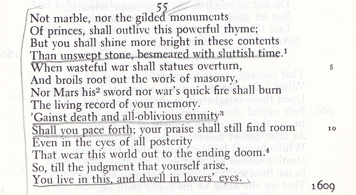The inspiration for this particular post comes from college pal TCJ, who, last week–two days after his own birthday–participated in the 3rd annual Shakespeare’s Birthday Sonnet Slam in Central Park, at which 154 people recited the 154 sonnets. When he told me he’d be reading number 55, I immediately flashed back to an English lit class I took as a sophomore. Our text was the 4th edition of The Norton Anthology of English Literature, still in residence on my den bookshelves all these years later. Sonnet 55 is on page 805; three and half lines are underlined in pencil.