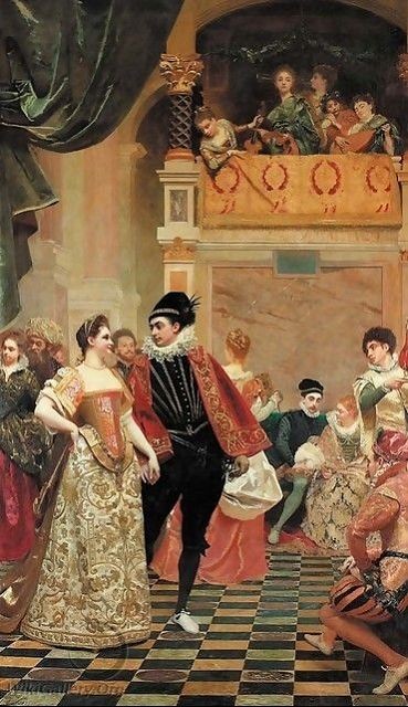 The pavane was a stately dance of the 16th-century European aristocracy, often used as an opportunity to display elegant dress and to open ceremonial balls. It’s presumed to have traveled from Italy to France and England by way of Spain; in southern Spain it was performed in churches on solemn occasions. (The name may come from the Spanish pavo or Italian pavone, for peacock, whose slow, prideful walk mimics the dance).